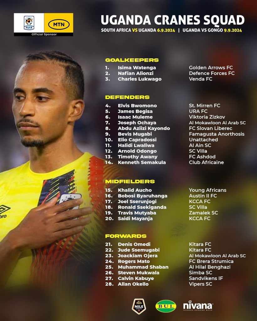 Uganda have named Golden Arrows goalkeeper Ismail Watenga and Venda FC’s Charles Lukwago in their squad to face South Africa in the 2025 Africa Cup of Nations qualifiers in September.