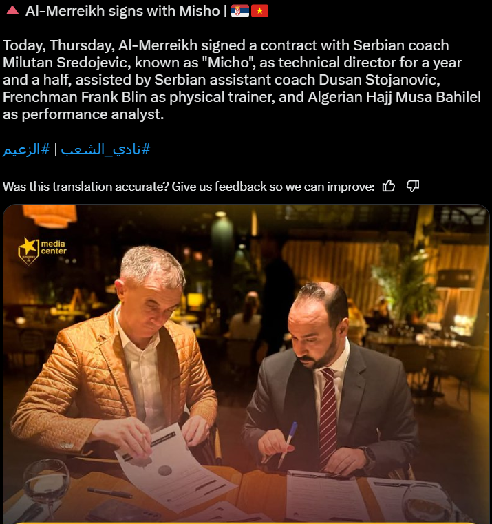 “Today, Thursday, Al-Merreikh signed a contract with Serbian coach Milutan Sredojevic, known as “Micho”, as technical director for a year and a half, assisted by Serbian assistant coach Dusan Stojanovic, Frenchman Frank Blin as physical trainer, and Algerian Hajj Musa Bahilel as performance analyst,” the statement read.
