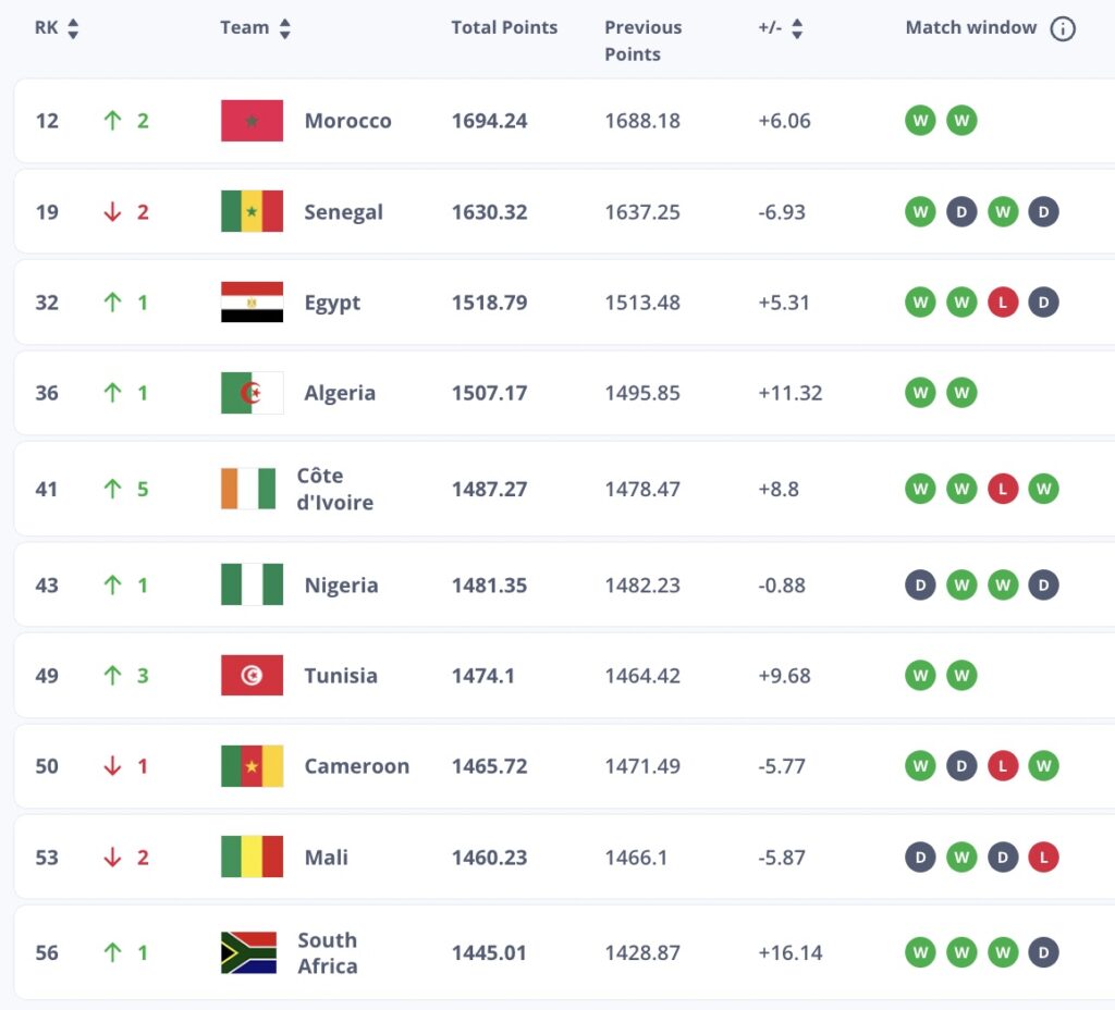 They are followed in 19th by Senegal, while Egypt are 32nd. Algeria in 36th and Ivory Coast in 41st complete Africa’s top five.