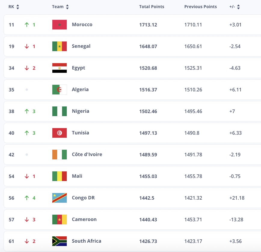 Morocco has stayed at the top of the African nations, climbing one spot into 11th worldwide, while Senegal are second among the African teams and 19th overall.