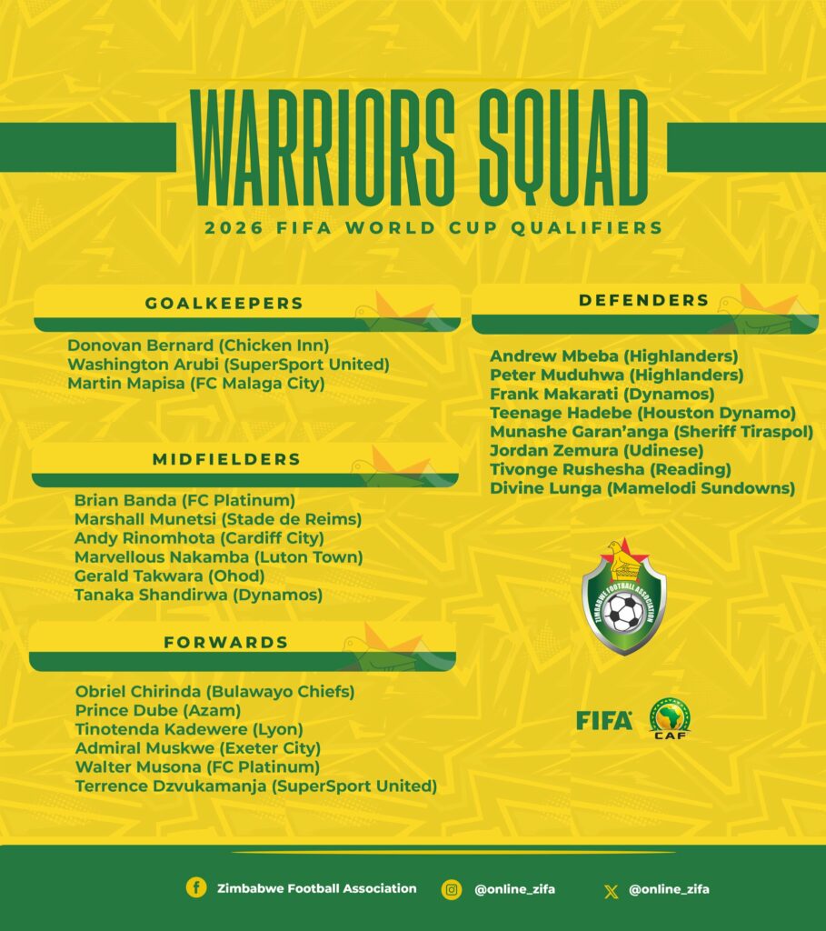 The Zimbabwean national team have called up three PSL stars – Washington Arubi and Terrence Dzvukamanja – both of SuperSport United, and Mamelodi Sundowns left-back Divine Lunga for their upcoming 2026 FIFA World Cup qualifiers.