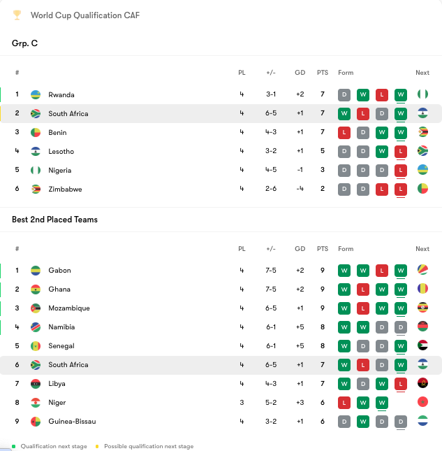 South Africa is currently second in Group C with seven points, level with Rwanda and Benin after four games played.