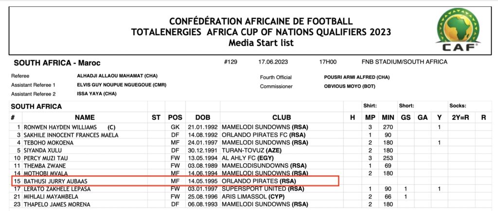 However, the Bafana team list, which was shared by the Confederation of African Football before the match, confusingly showed Aubaas as Pirates player.