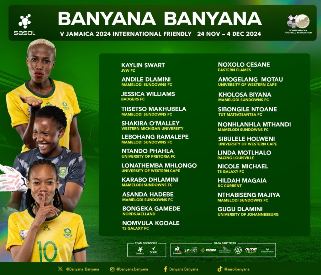 Banyana Banyana head coach Dr Desiree Ellis has named the squad to play Jamaica over two international friendlies at the end of this month.