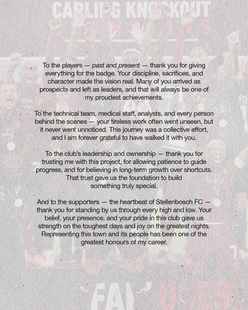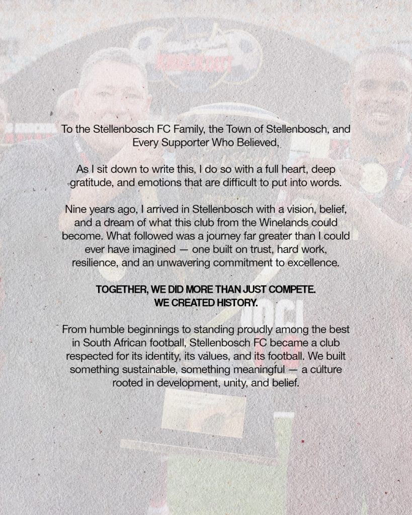 During his nine-year tenure at Stellies, the former AmaZulu and AmaTuks mentor steered them into the elite football division before leading them to their first silverware in the club’s history in the form of the Carling Knockout Cup in 2023/24.