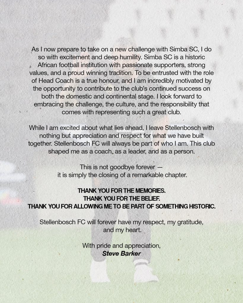 Former Stellenbosch FC head coach Steve Barker has bid farewell to everyone at his former employers after taking up a coaching job at Tanzanian giants Simba SC.