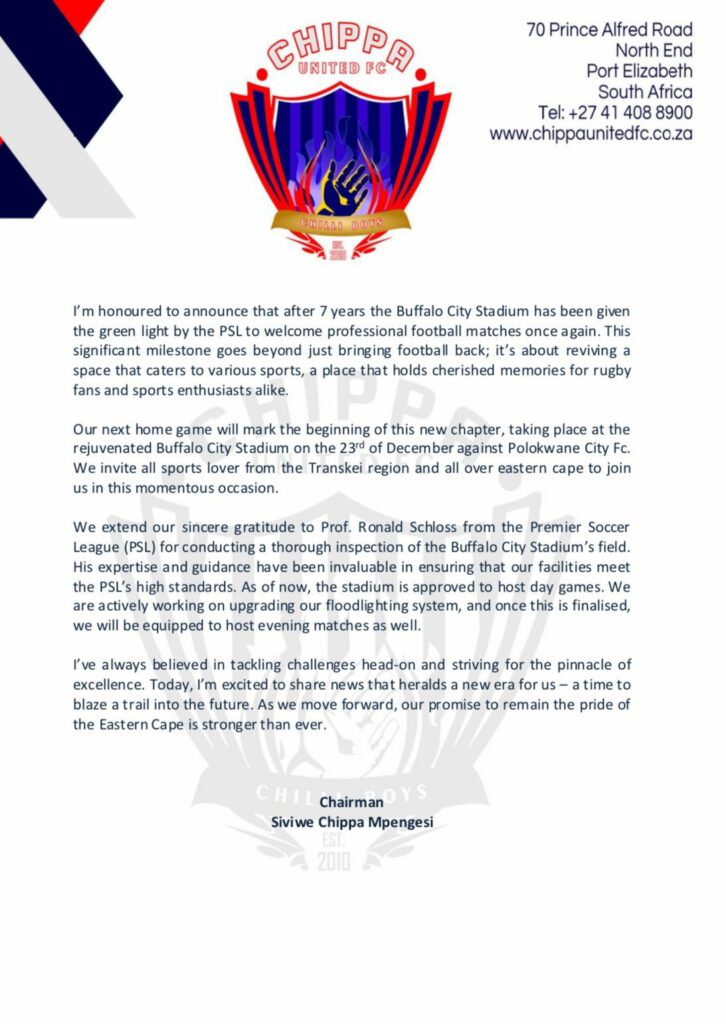 Chippa United chairman Chippa Mpengesi has announced that the Premier Soccer League have approved Buffalo City Stadium for DStv Premiership matches.