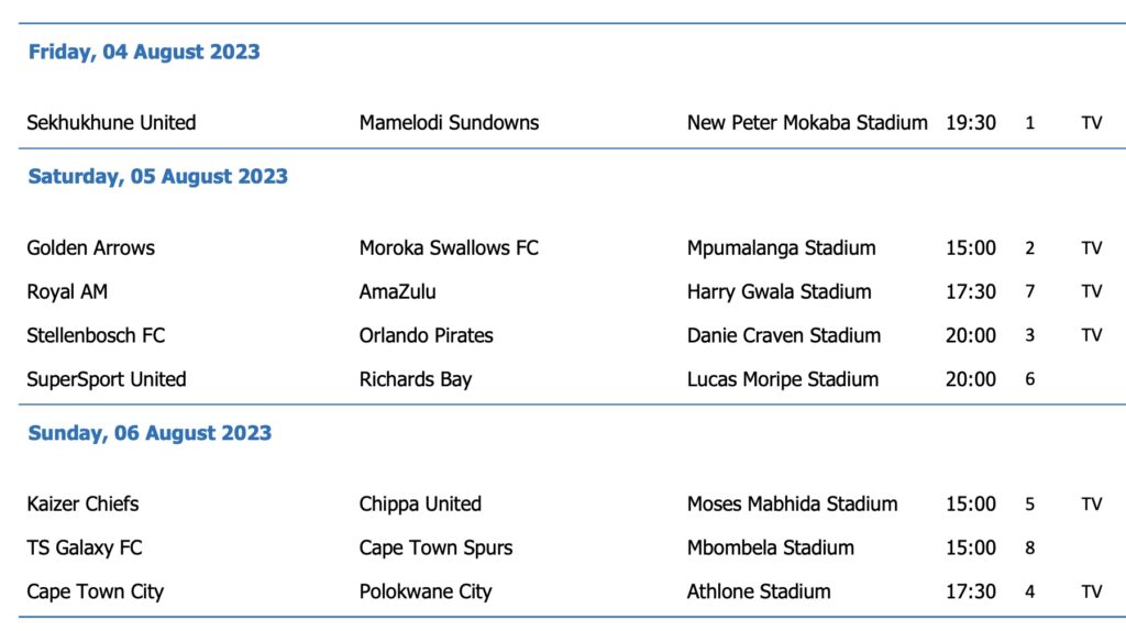 The first round of fixtures is followed by a round of midweek clashes, including Sundowns hosting Kaizer Chiefs on Wednesday, 9 August (Women’s Day) at 15:00.