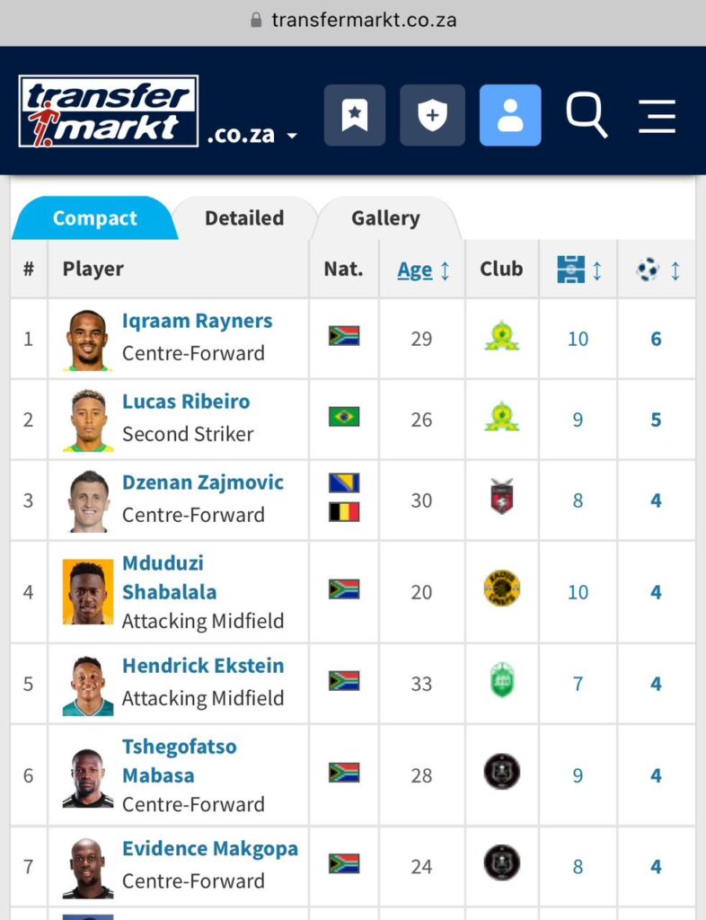 In fourth spot, is Amakhosi’s young talent Shabalala, who is just 20, and has racked up four goals in 10 appearances and is the club’s top goalscorer so far this season.