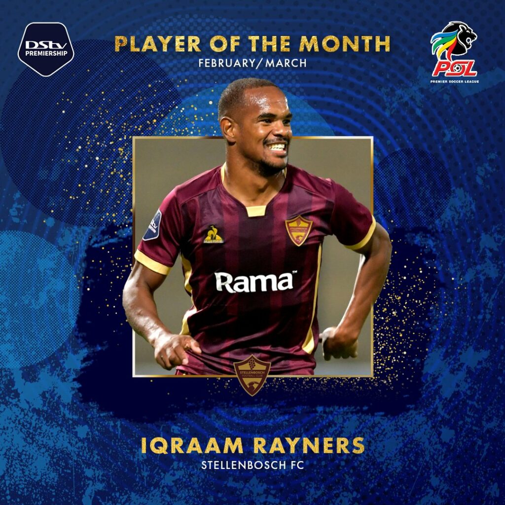The Player of the Month award was collected by Iqraam Rayners has become the first Stellenbosch FC player to win the DStv Premiership Player of the Month award. The speedy forward produced 5 goals in 4 games during February/March.