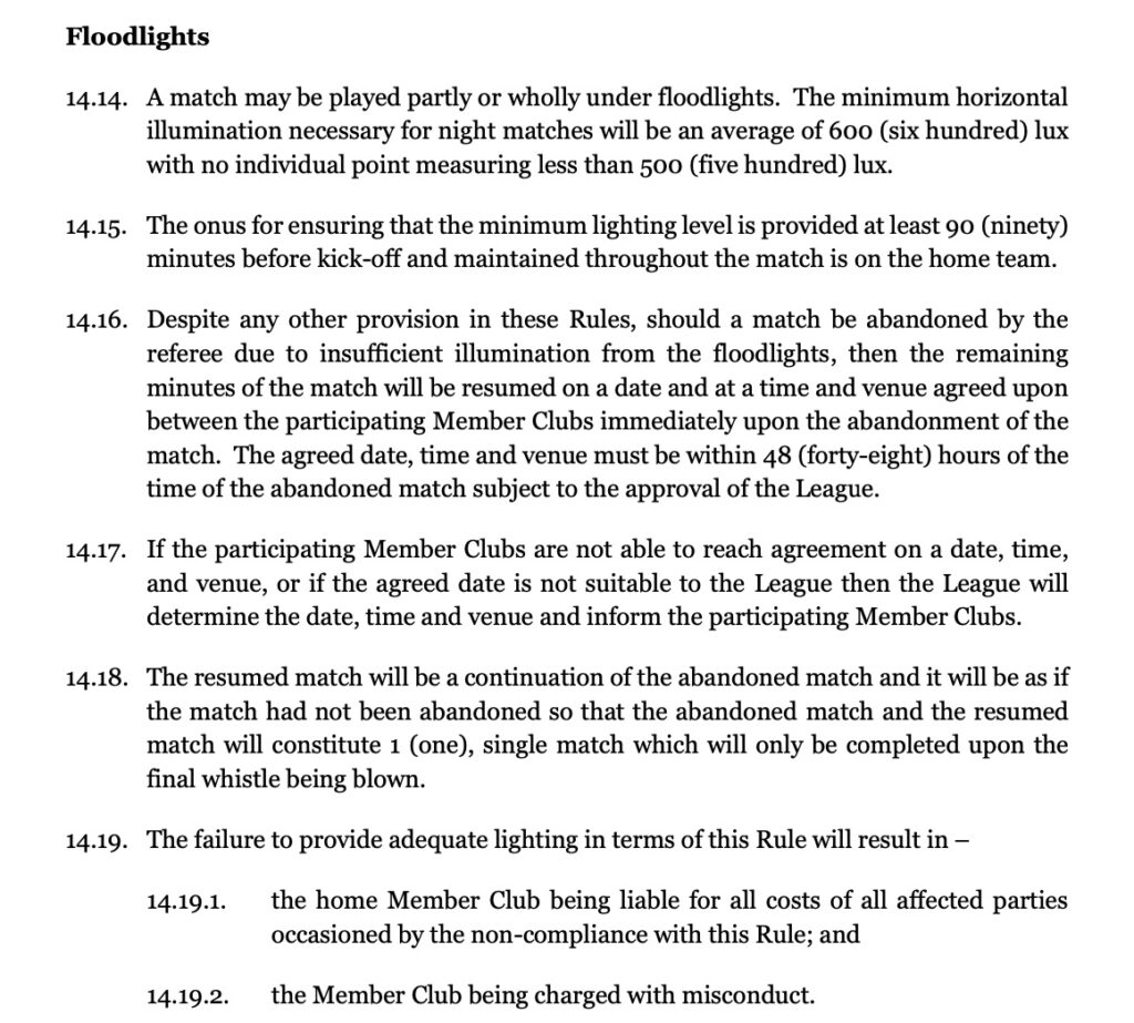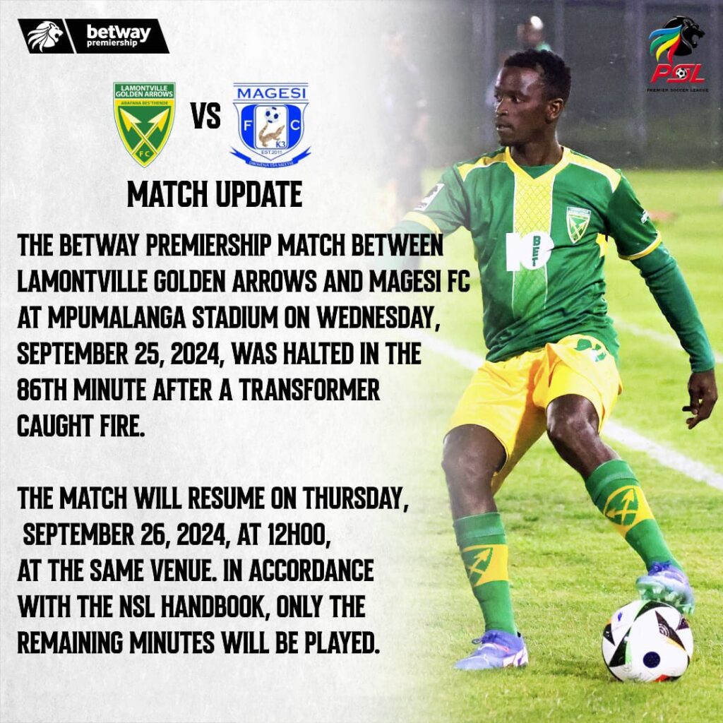 The Betway Premiership match between Golden Arrows and Magesi FC was abandoned with only a few minutes left to play due to a power cut at Mpumalanga Stadium – here is what the rules say.