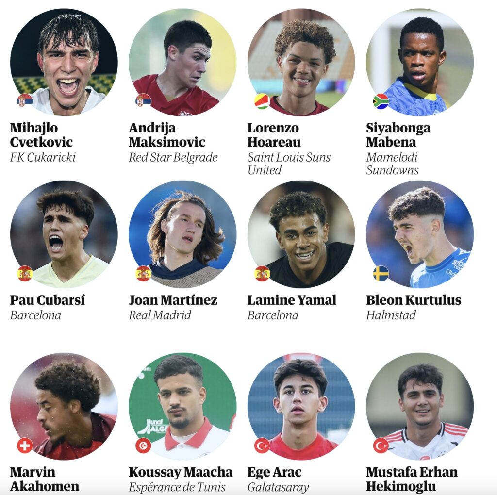 Meanwhile, FC Barcelona duo Lamine Yamal (17) and Pau Cubarsi (17) are among the more established names on the list, having come through Barca’s famed La Masia academy and already starring at the highest level for their club.