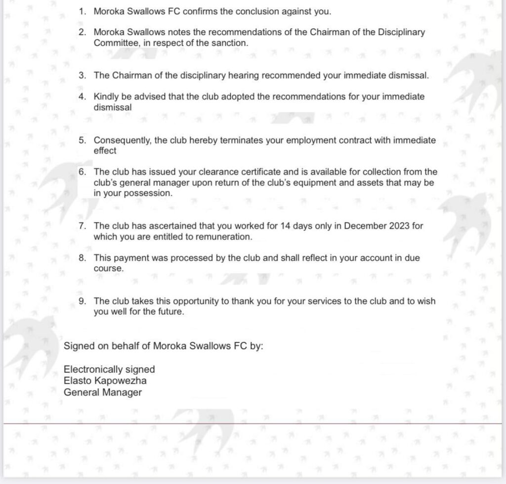 The recently dismissed Moroka Swallows players have received letters stating they will only be paid for 14 days, not for the entire month of December.