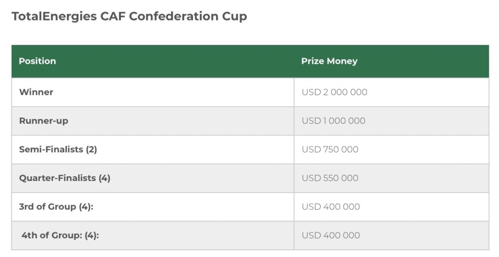 “In the TotalEnergies CAF Champions League, the winner will get USD 4 000 000 – an increase from the USD 2 500 000. In the TotalEnergies CAF Confederation Cup, the prize money for the winner has increased from USD 1,250,000 to USD 2 000 000.”