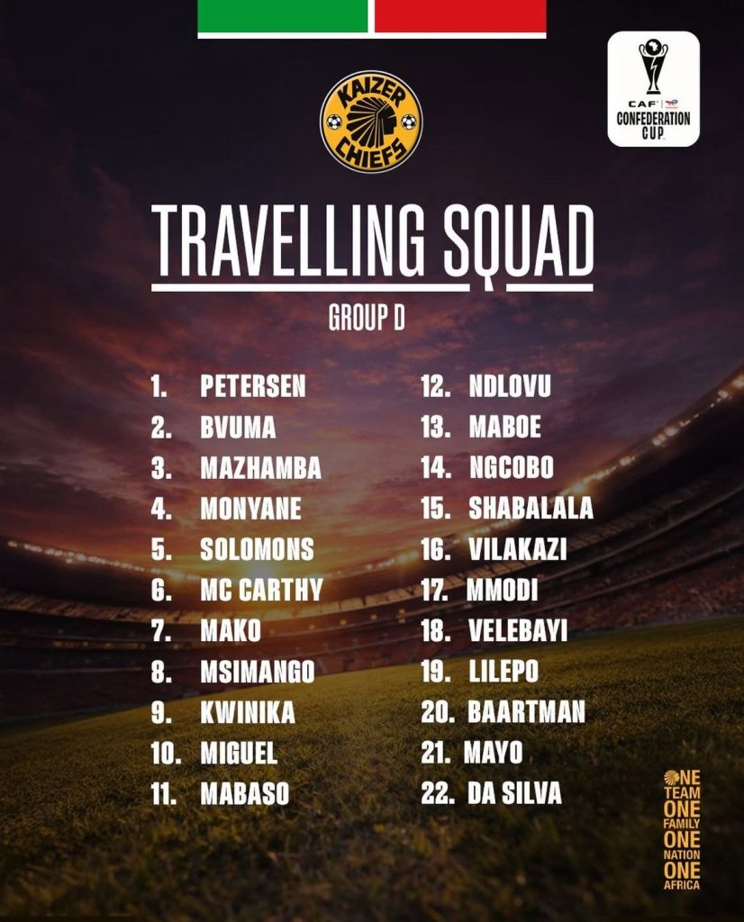 Kaizer Chiefs have announced their traveling squad for the CAF Confederations Cup clash at ZESCO United.