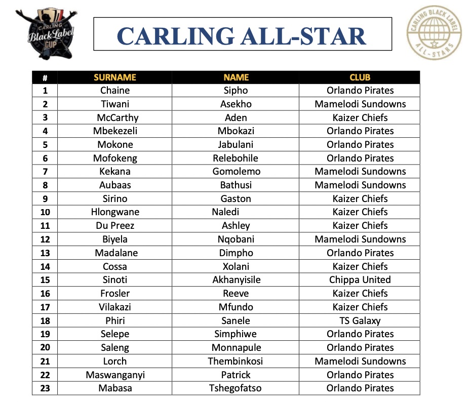 Overall, the Carling All Star squad consists of nine players from Pirates, seven from Chiefs, five from Downs as well as one Chippa United and one TS Galaxy player, respectively.