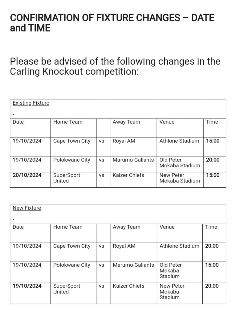 The Premier Soccer League has announced a change in date and kick off times for Kaizer Chiefs‘ Carling Knockout Cup round of 16 clash against SuperSport United as well as two other fixtures.