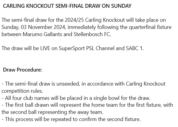 The Premier Soccer League (PSL) has confirmed that the 2024/25 Carling Knockout semifinal draw will take place on Sunday, 3 November, after the quarterfinal fixture between Marumo Gallants and Stellenbosch.