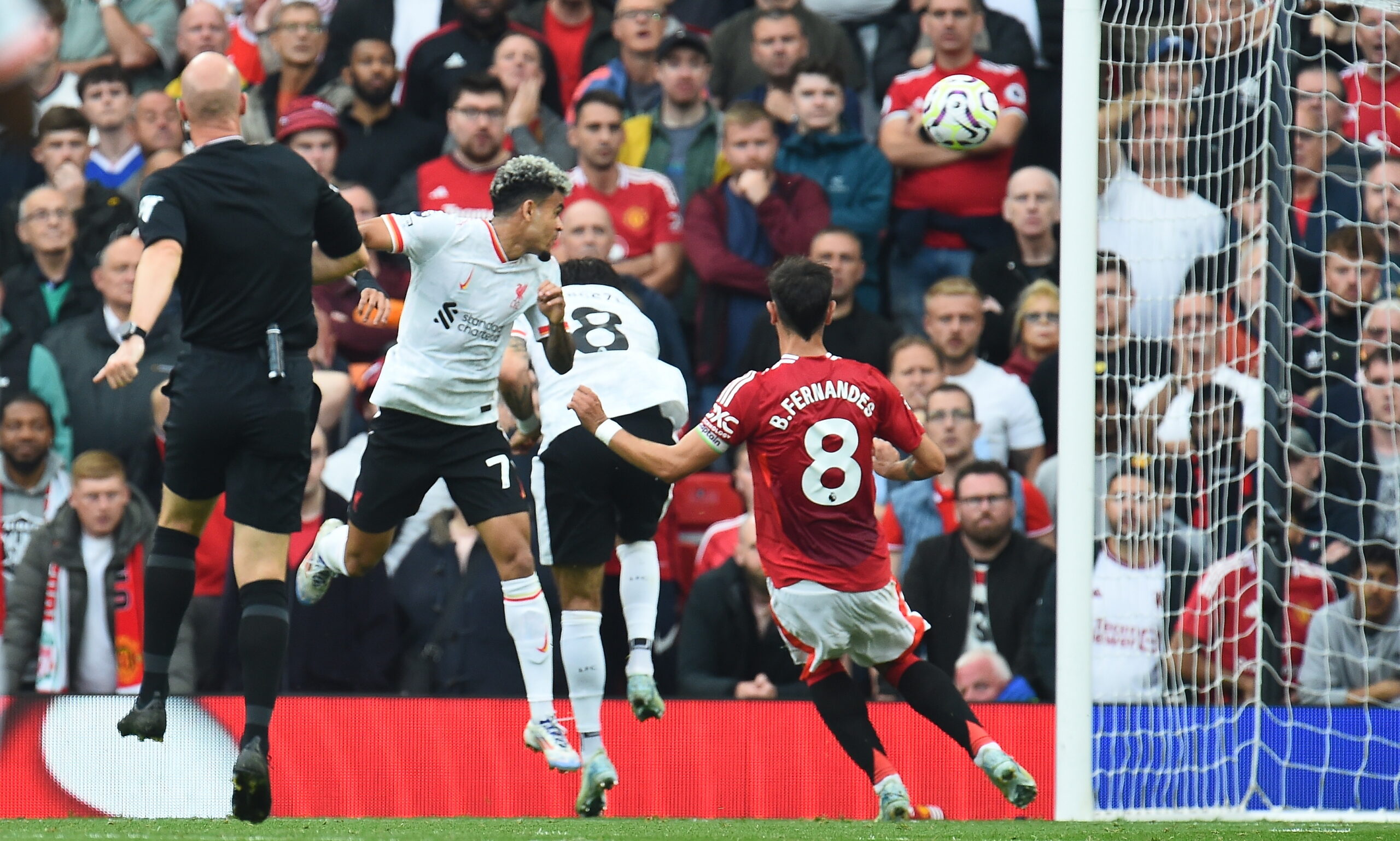 In the 35th minute, Luis Diaz opened the scoring for Liverpool in the derby after meeting Mohamed Salah’s cross at the far post to head past Andre Onana.