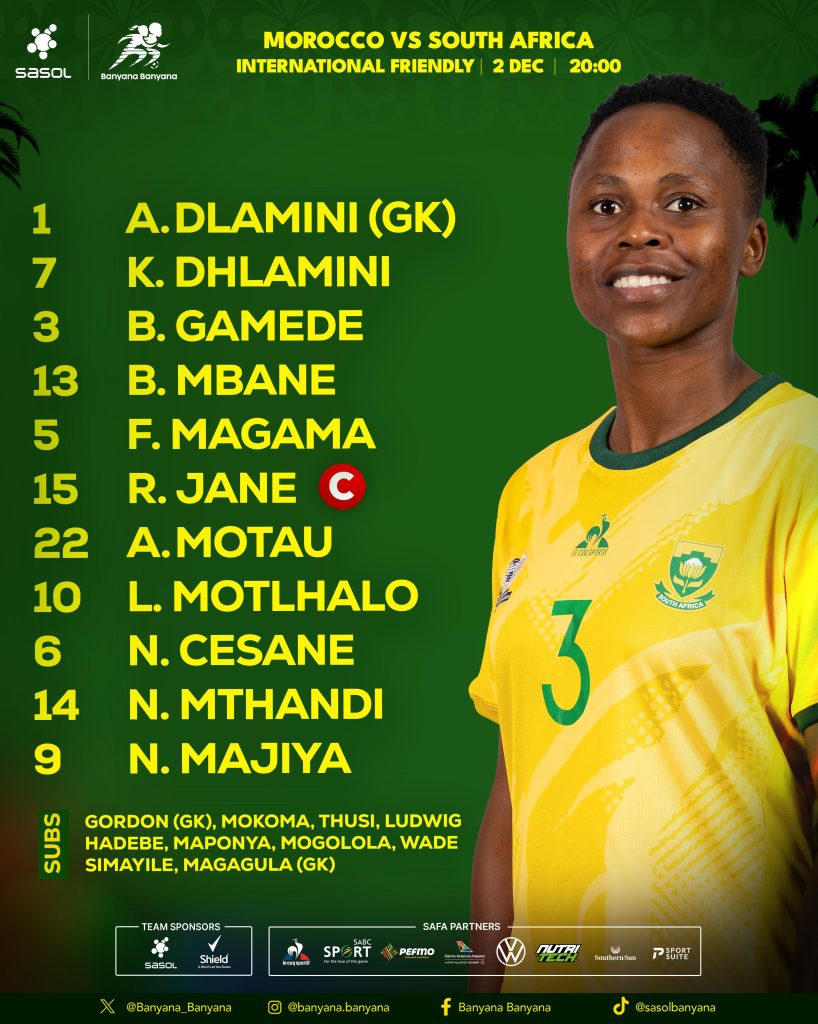 Banyana Banyana head coach Dr Desiree Ellis has named her starting line-up for this evening’s friendly international against Morocco at Stade D’Agadir.