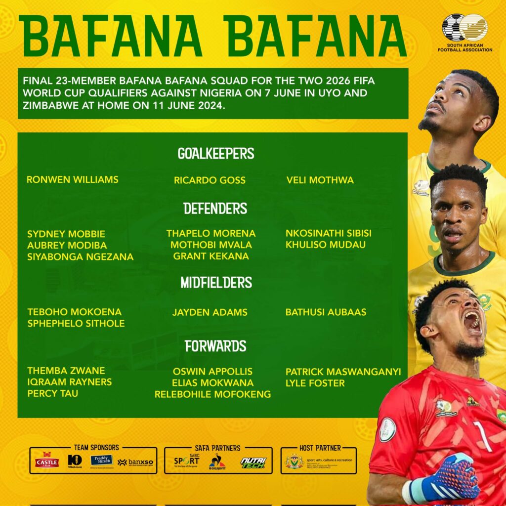 Bafana Bafana coach Hugo Broos has announced his final 23-man squad for the upcoming 2026 FIFA World Cup qualifiers against Nigeria and Zimbabwe.