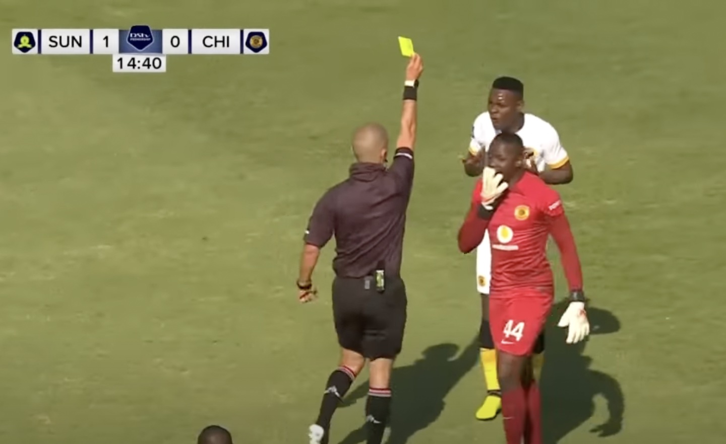 However, Ngezana’s teammate did receive a yellow card, with many wondering whether it was a mistake by match official Victor Gomes or whether Kwinika was booked for something he said.