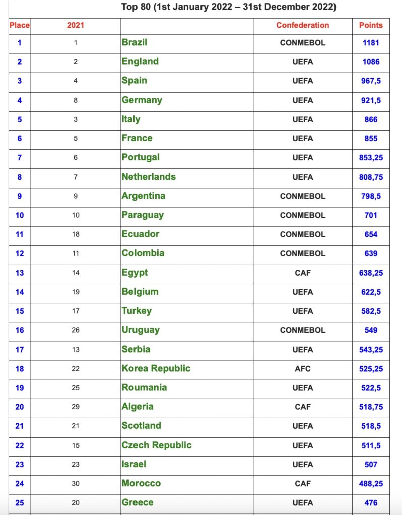 Rankings are calculated using the sum of all weighted points in each competition from January to December, with the Brazilian Serie A ranked as strongest league in 2022, for a second year running.