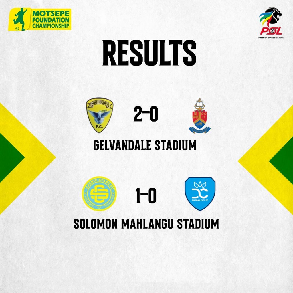 On Friday afternoon, Eastern Cape-based side Highbury FC shocked Pretoria University 2-0 with gospel singer Mzoxolo Rafani and Matome Mabeba scoring as they moved into ninth place.