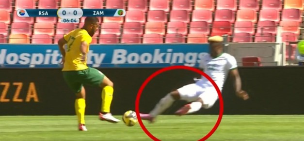 With just six minutes on the clock, and with Bafana Bafana on the attack, the Zambian defender lunged at Mbule to prevent an early goalscoring opportunity for the hosts.