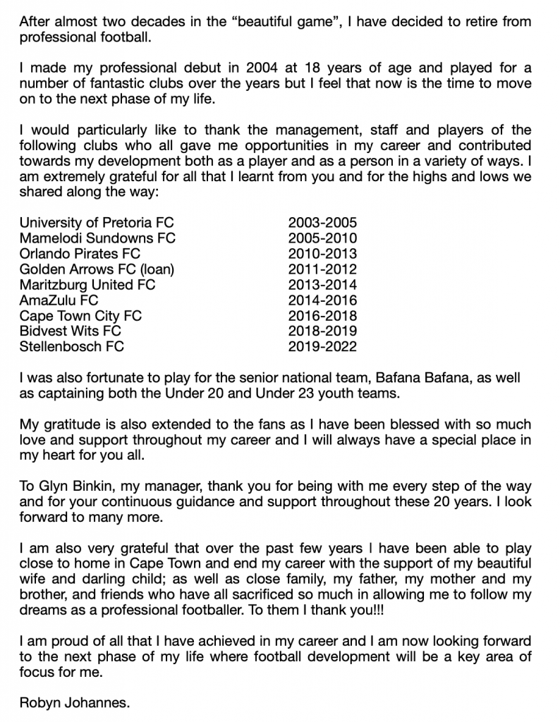 After departing Stellenbosch FC at the end of last season, Robyn Johannes has retired from professional football.