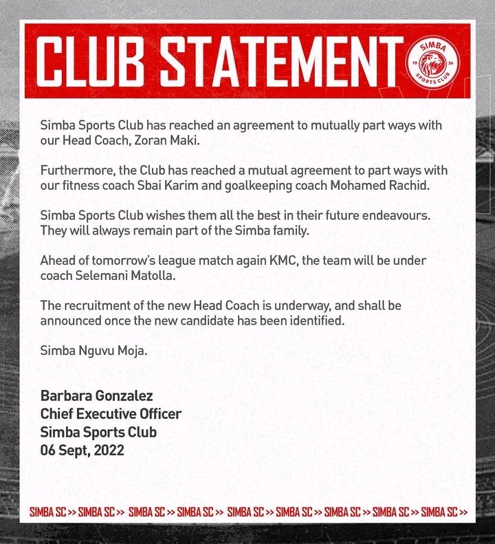 Simba SC have sacked their new coach Zoran Manojlović after just 70 days in charge, the club confirmed on Tuesday.