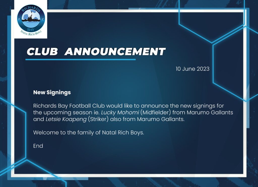 Richards Bay have announced their first two signings ahead of the 2023/24 campaign on Saturday afternoon.