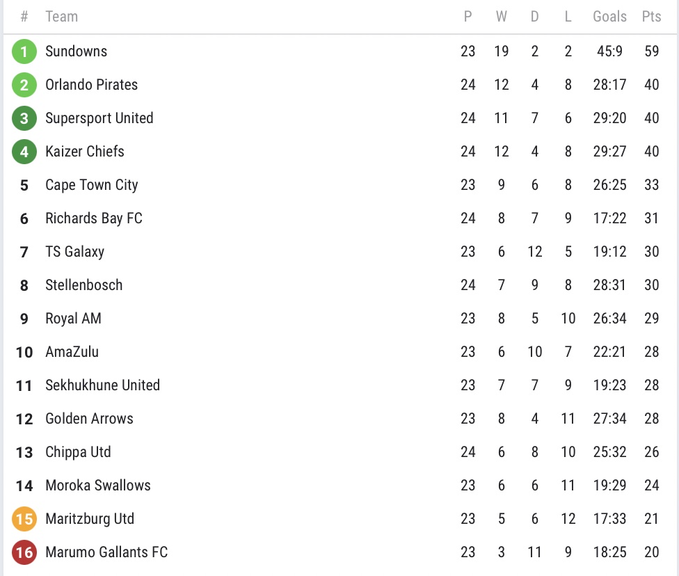 Sundowns have picked up 59 points from 23 games, winning 19 of their league games, drawing two and just losing two. They’ve scored 45 times and only conceded nine so far.
