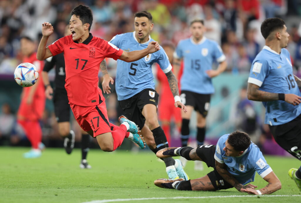epa10325075 Sangho Na (L) of South Korea in action during the FIFA World Cup 2022 group H soccer match between Uruguay and South Korea at Education City Stadium in Doha, Qatar, 24 November 2022. EPA/Tolga Bozoglu