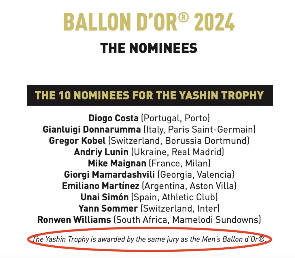 Just like with the Ballon D’or, the Yashin Trophy will be decided “by a jury of football journalists representing the top 100 countries in the FIFA Men’s Ranking”.