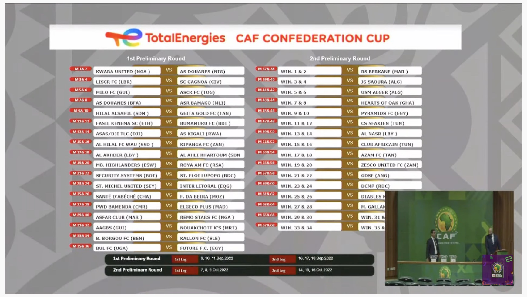 Defending champions RS Berkane (Morocco), USMA, JS Saoura (Algeria), Diables Noirs (Congo), DC Motema Pembe (DR Congo, Pyramids (Egypt), Azam FC (Tanzania), CS Sfaxien, Club African (Tunisia), Zesco United (Zambia) and Marumo Gallants are all exempted from the TotalEnergies CAF Confederation Cup first round.