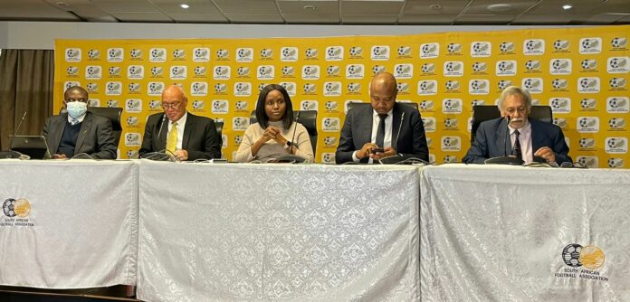 Henderson’s report led SAFA Vice President Bennett Bailey, CEO Lydia Monyepao, CFO Hluyo, former General Manager of the 2010 FIFA World Cup Legacy Trust, Joe Carrim, and SAFA’s legal representative, Lesedi Mphahlele, address members of the media at SAFA House on Friday to give an update on the actions being taken against Henderson.