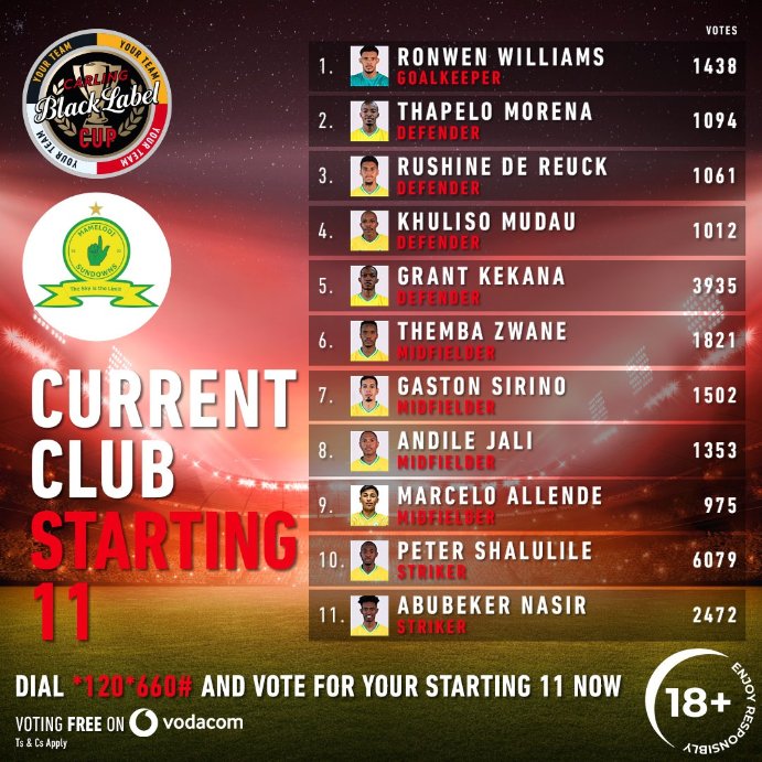 At Mamelodi Sundowns it doesn’t surprise that Peter Shalulile has received the most votes with 6,079 so far. He is followed by Grant Kekana with 3,935 votes and Abubeker Nasir with 2,472 votes.