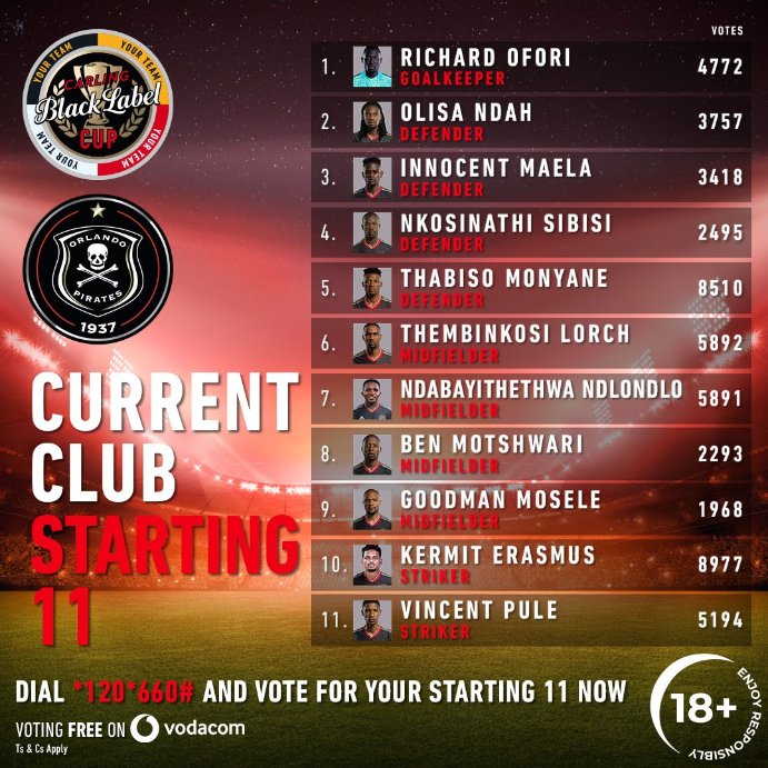 At Orlando Pirates, new signing Kermit Erasmus leads the votes, having received 8,977 votes, while Thabiso Monyane follows with 8,510 in second position and Thembinkosi Lorch with 5,892 in third.