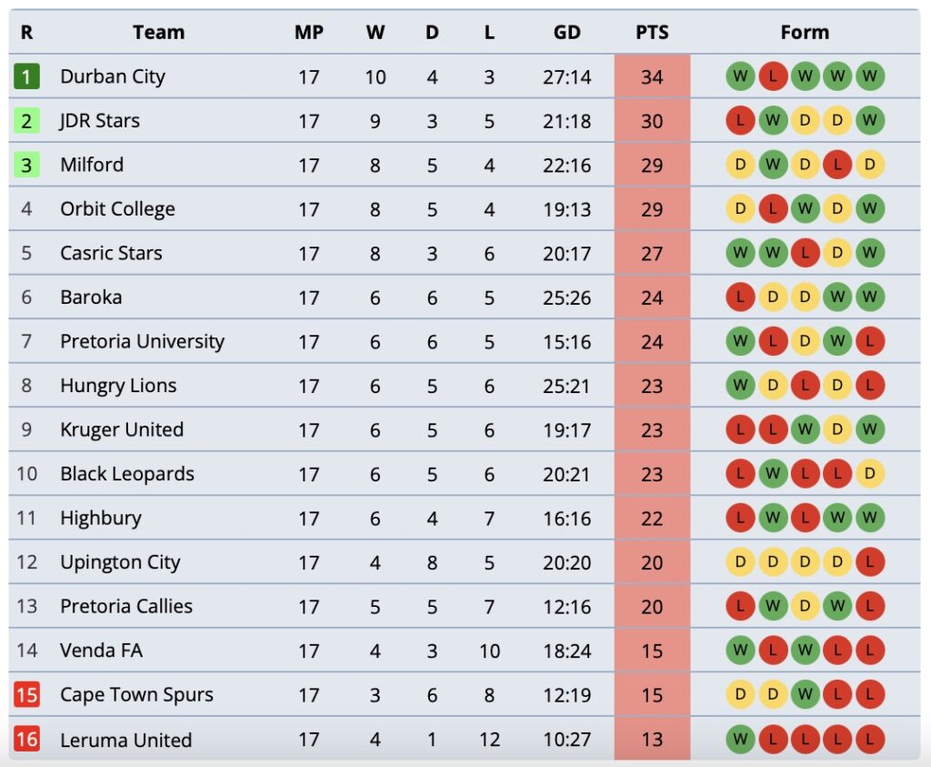 Durban City have opened a gape at the top to four points after beating Kruger United, while Cape Town Spurs have dropped into the relegation spots.