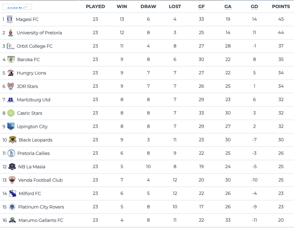 At the bottom of the table, Platinum City Rovers moved off bottom spot as they beat Venda FC, which leaves Marumo Gallants, relegated from the DStv Premiership last season, in bottom place, as Milford also picked up a vital win.
