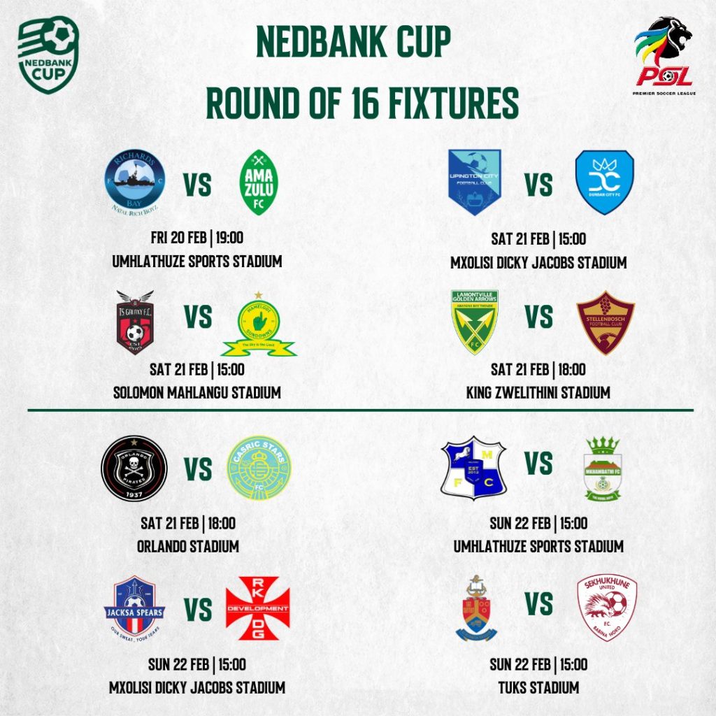 The Premier Soccer League have confirmed the details for the Nedbank Cup Last 16 clashes.