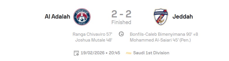 Al Adalah now take the trip to Al Zulfi for their next league match on Wednesday, 25 February, with Jeddah at home against Al Diriyah on the same day.