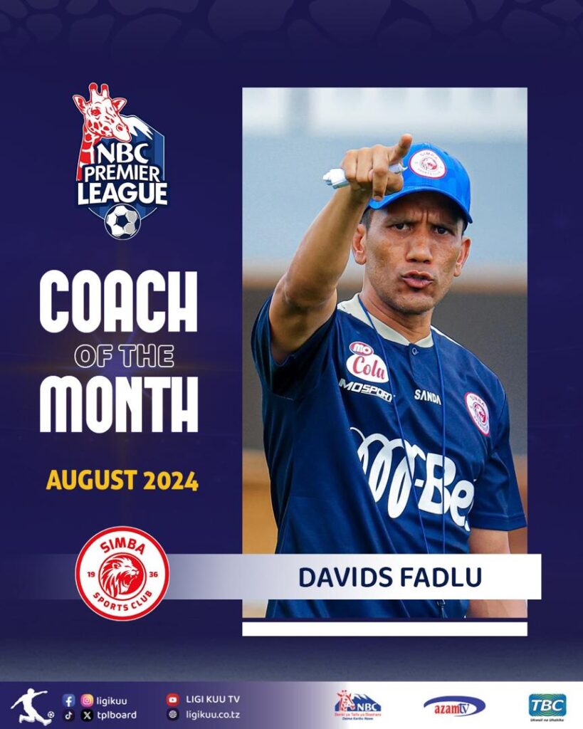 Simba SC head coach Fadlu Davids has been awarded the Coach of the Month accolade for August after an unbeaten run in Tanzanian football.