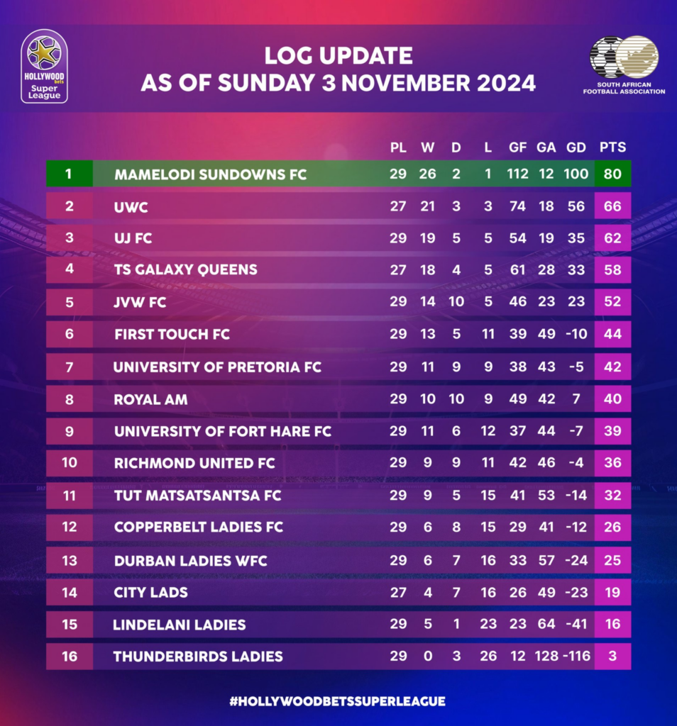 In the only other game from the weekend, University of Western Cape (UWC) lost 2-1 to JVW FC. Keolebogile Putu and Jessica Wade were on the score sheet for the Blue Diamonds as they remained in fifth place with 52 points from 29 games. UWC, who are gearing up for their debut at the Champions League, remained in second position with 66 points with two games to go.