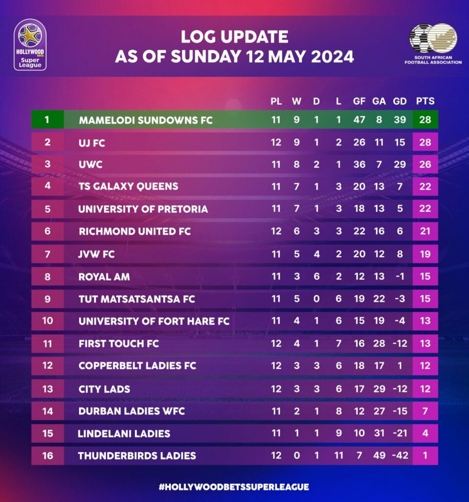 University of Johannesburg (UJ) kept up with the defending champions and maintained second place on the log after their 3-0 win over TUT Matsatsantsa in Soweto. Ayesha Moosa was on the score sheet once more, with Thato Mofolo getting brace, as they made it 28 points, however having played one game more than the current leaders. Matsatsantsa Ladies dropped to ninth position with 15 points in 11 games.