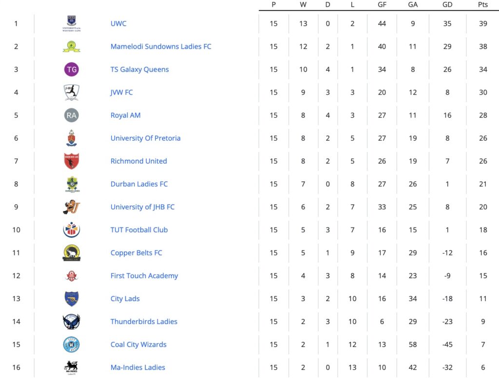 Sundowns are now second on the standings with just a point separating them from UWC while Thunderbirds remained in 14th position with nine points from the same number of games.