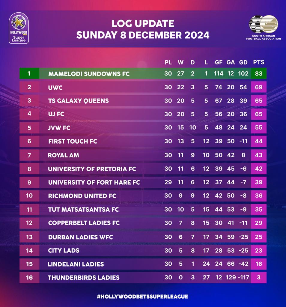 Champions Mamelodi Sundowns Ladies wrapped up the 2024 Hollywoodbets Super League season in style, as they defeated University of Western Cape 2-0 in the final match of the campaign at the Lucas Moripe stadium on Sunday.