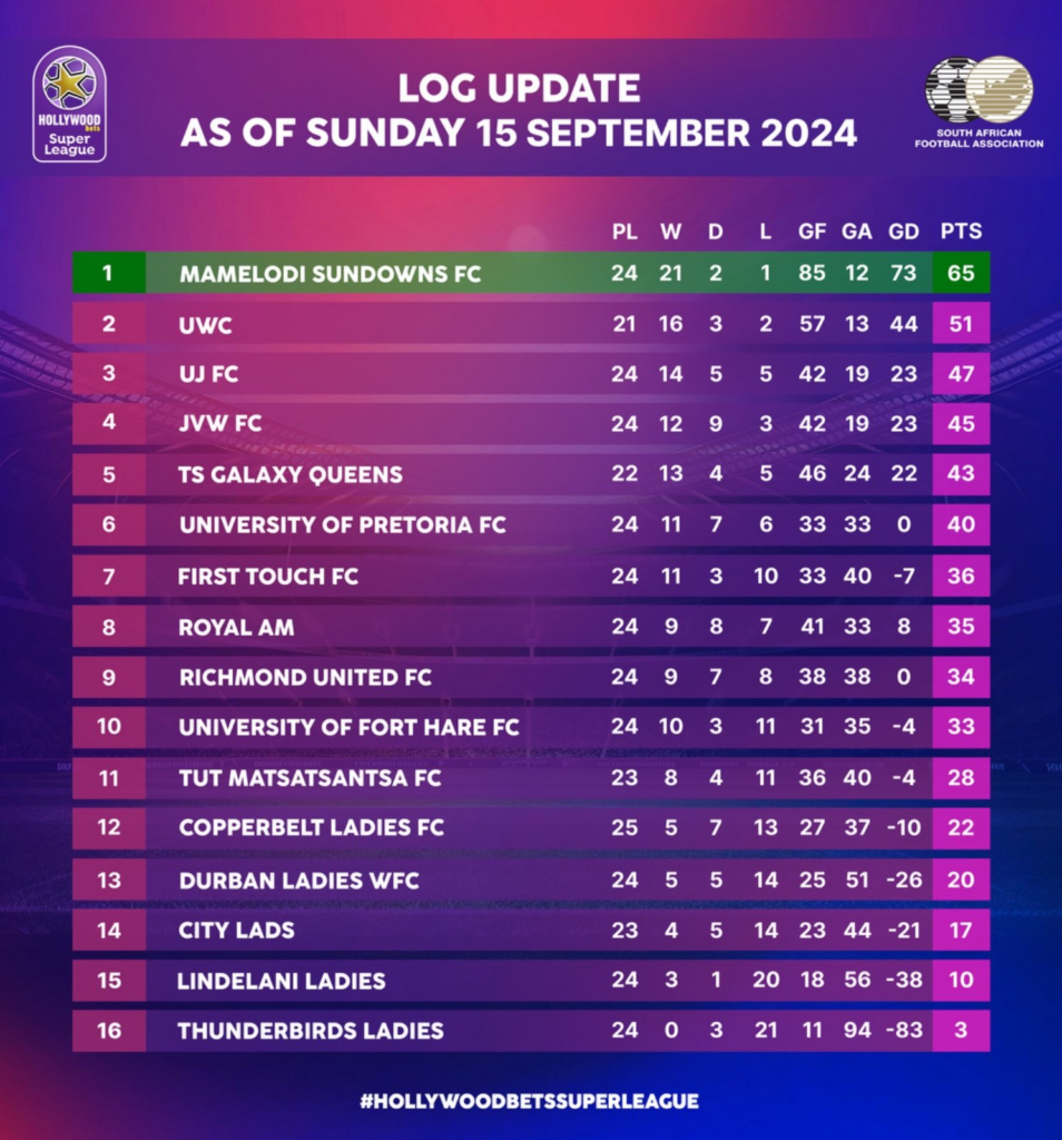 This week’s round of the Hollywoodbets Super League saw Mamelodi Sundowns Ladies further stretch their lead at the summit to 14 points.