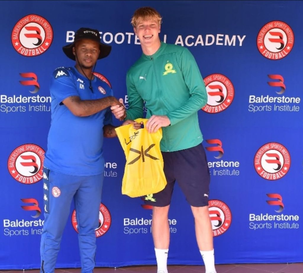 Rasthoem Simons, the agent of Mamelodi Sundowns target Angus ‘Haaland’ Moss has confirmed that the tall striker is training with Masandawana but he hasn’t been signed yet.